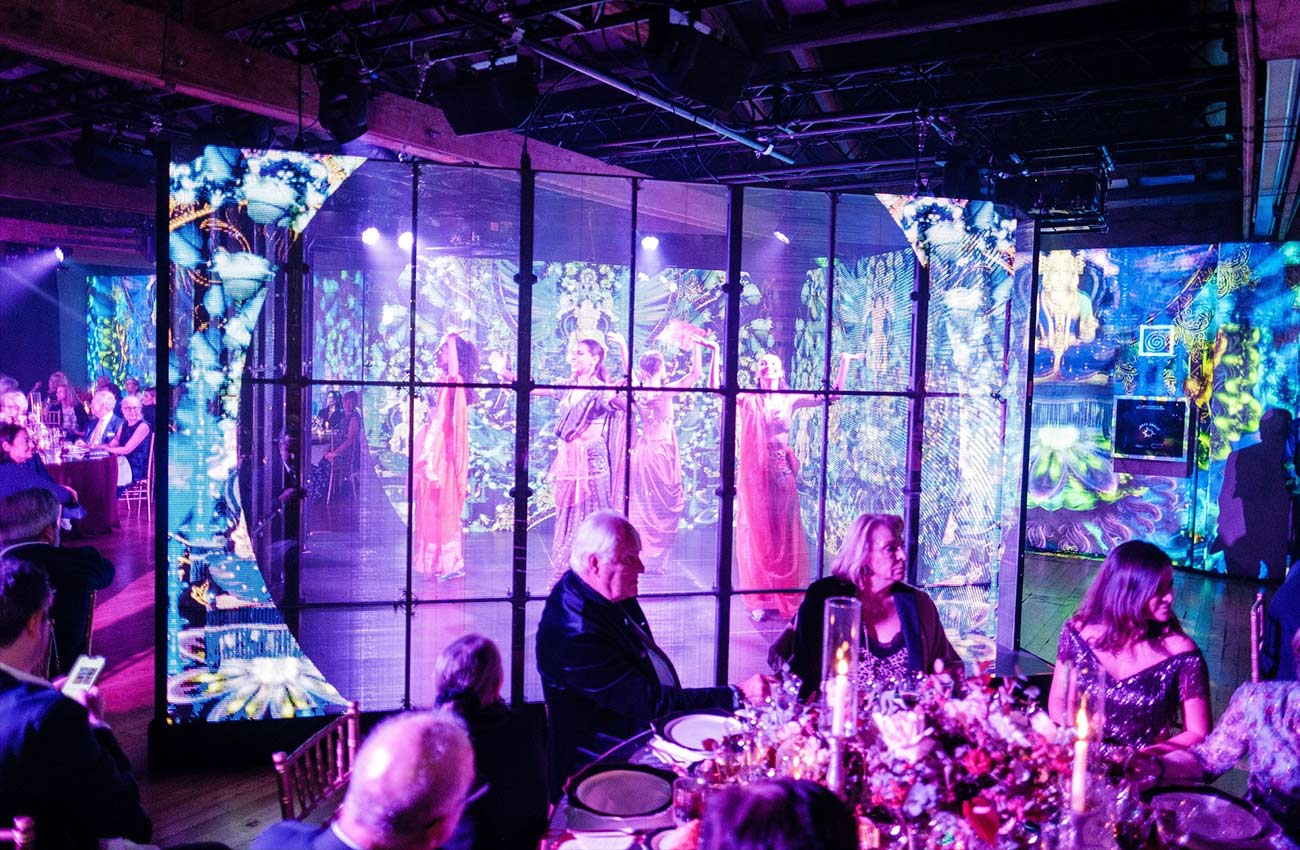 To travel, we needed an extraordinary vehicle! For this reason, we created an immersive setup by combining video projections with a stage formed by a transparent Led Cube that, placed in the center of the space, acted as a portal capable of transporting the audience between the different cities around the world.