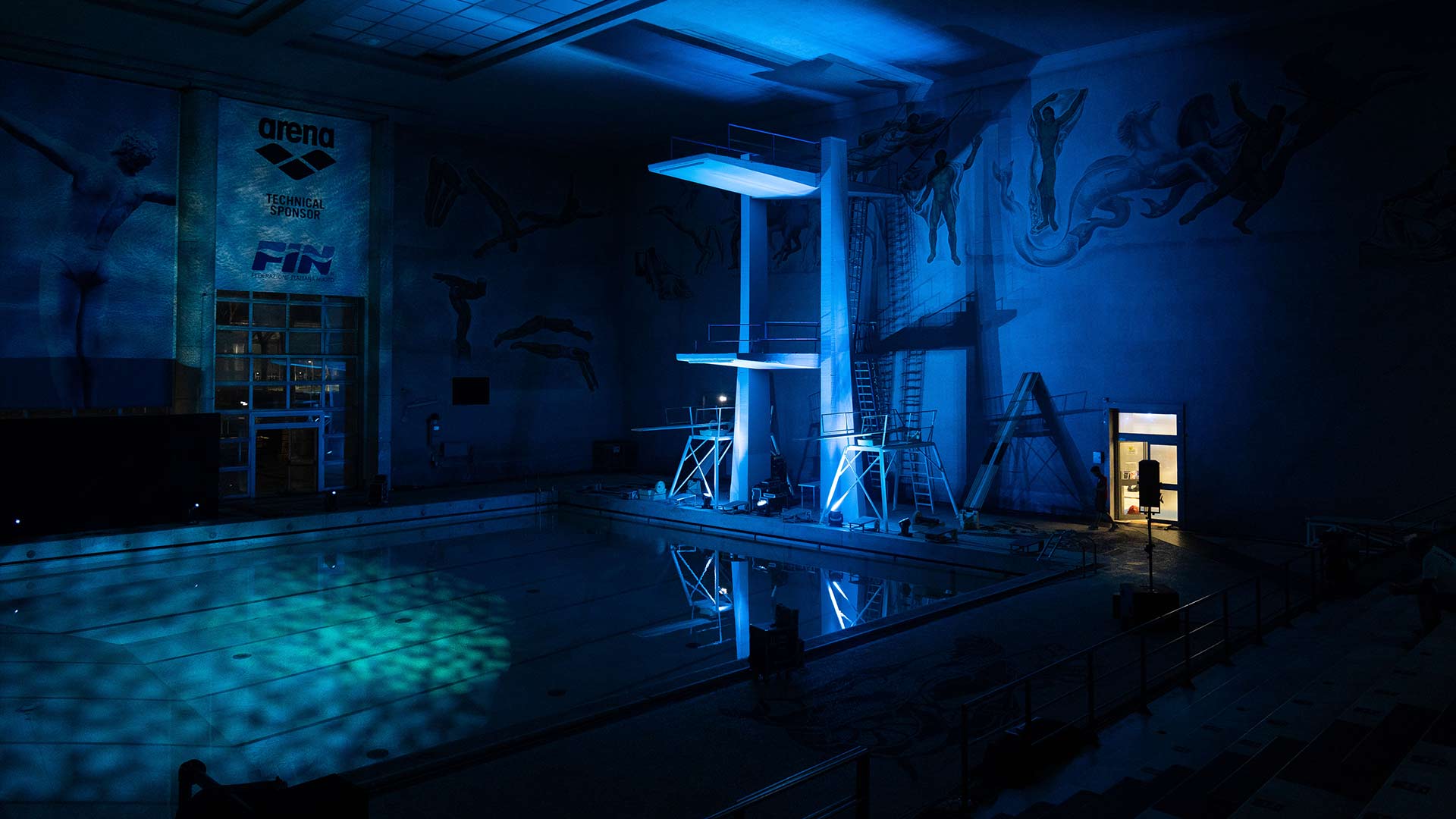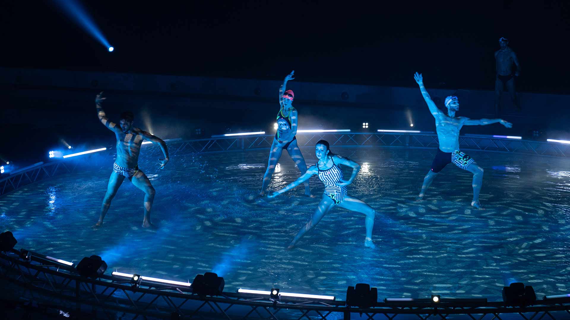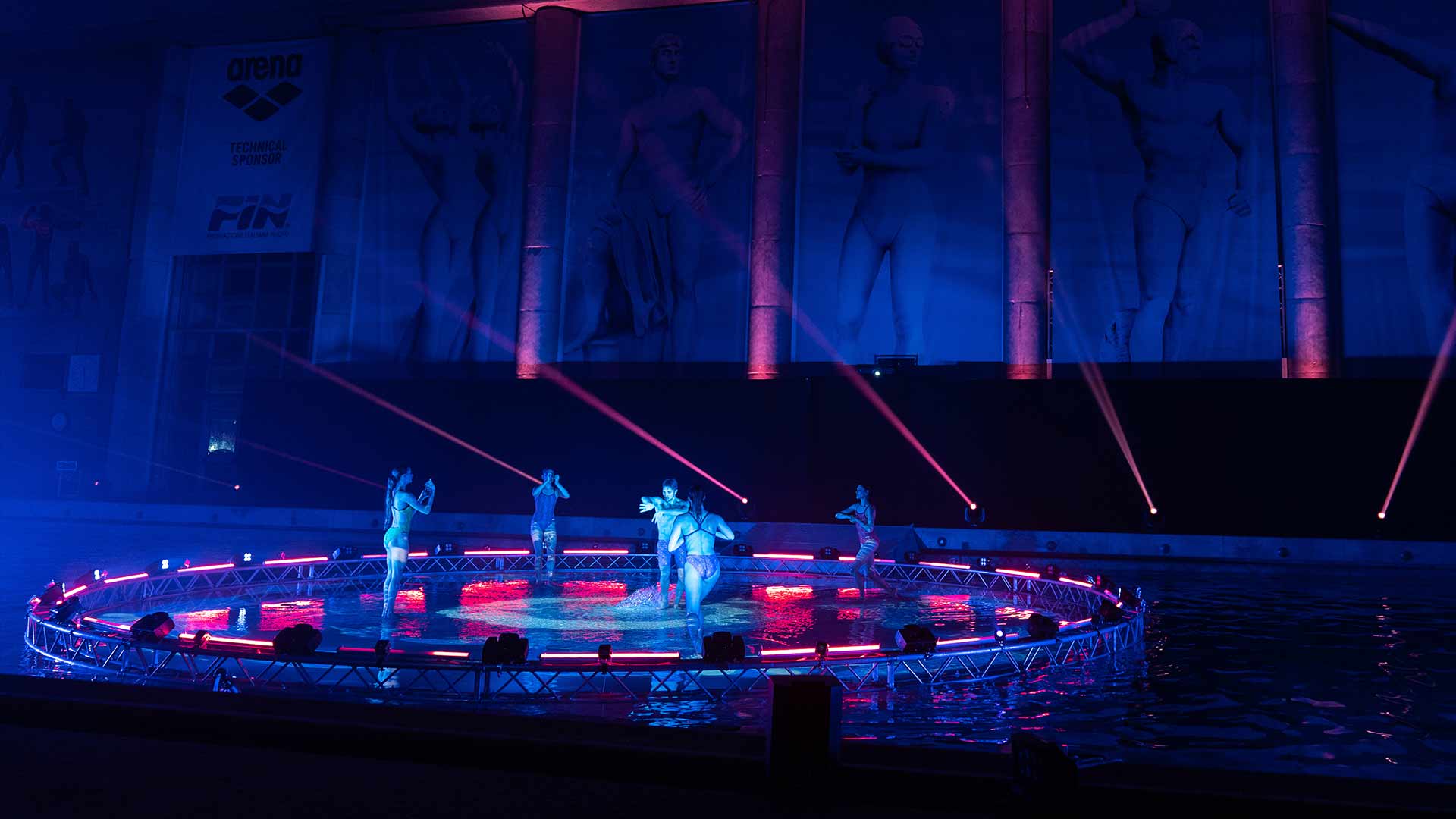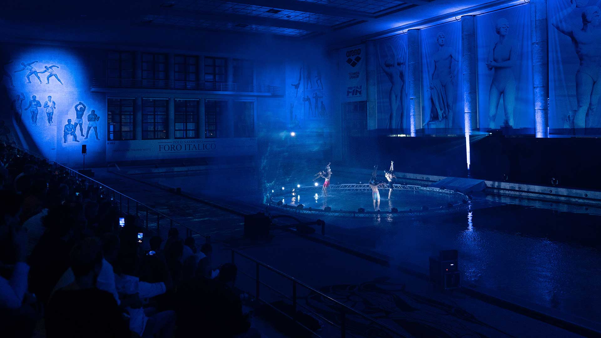 Sede del nostro show è la Piscina dei Mosaici, un’icona del nuoto italiano all’interno del Foro Italico di Roma. La sfida è stata realizzare un palco interamente in acqua per i nostri danzatori, aggiungendo interventi artistici coordinati di atleti provenienti dalla nazionale di nuoto sincronizzato e di tuffo da trampolino.
