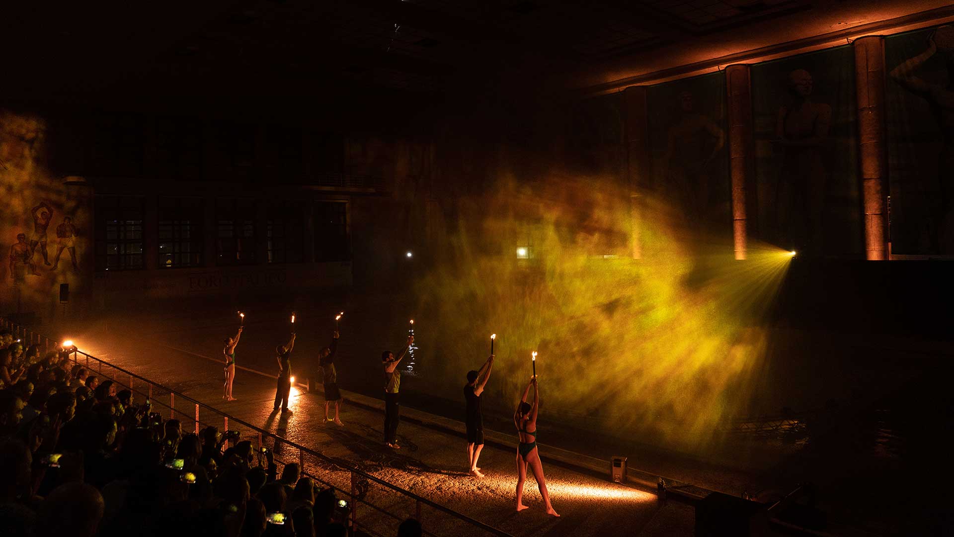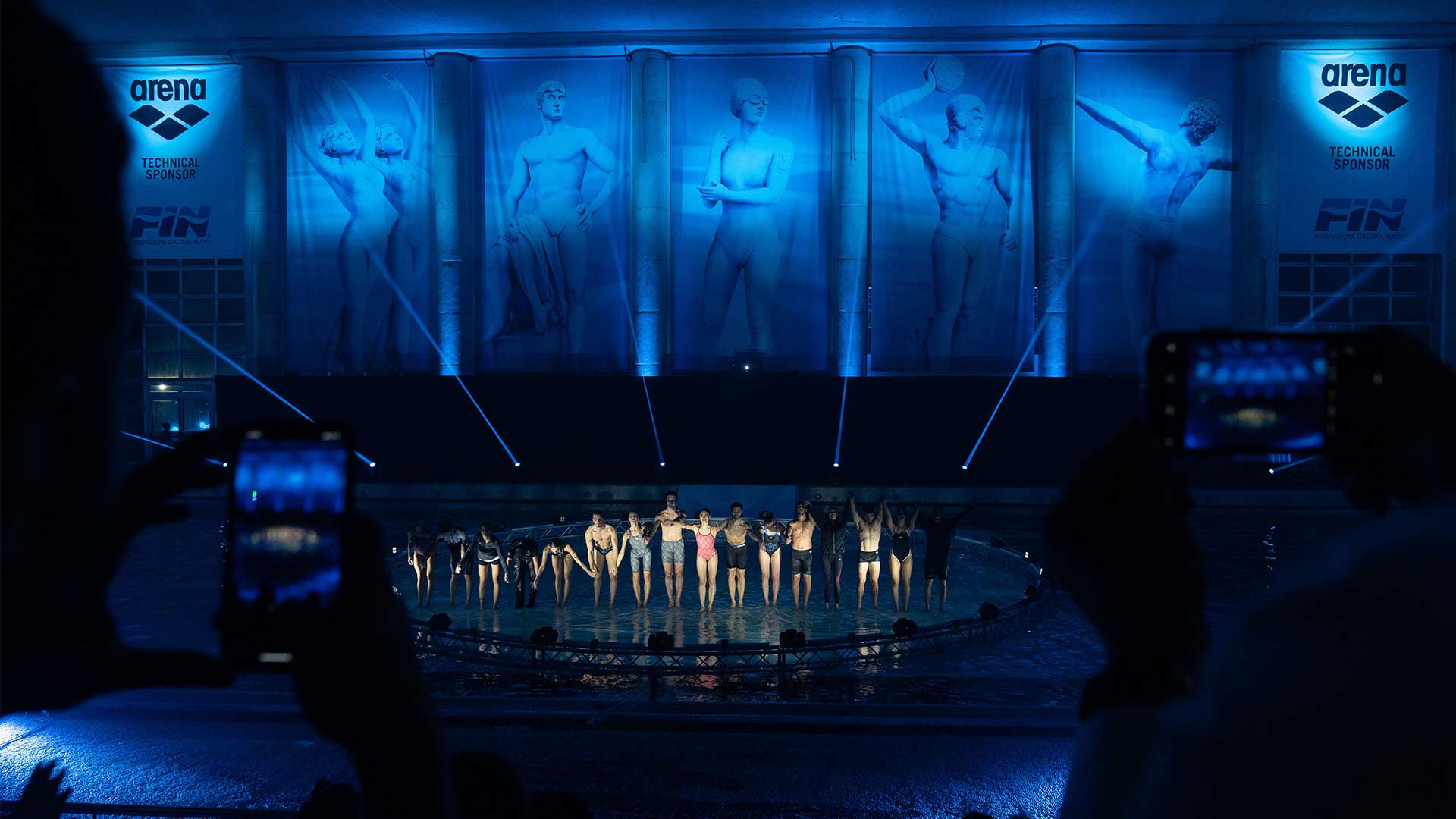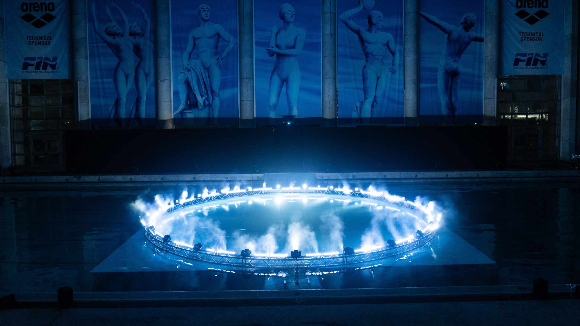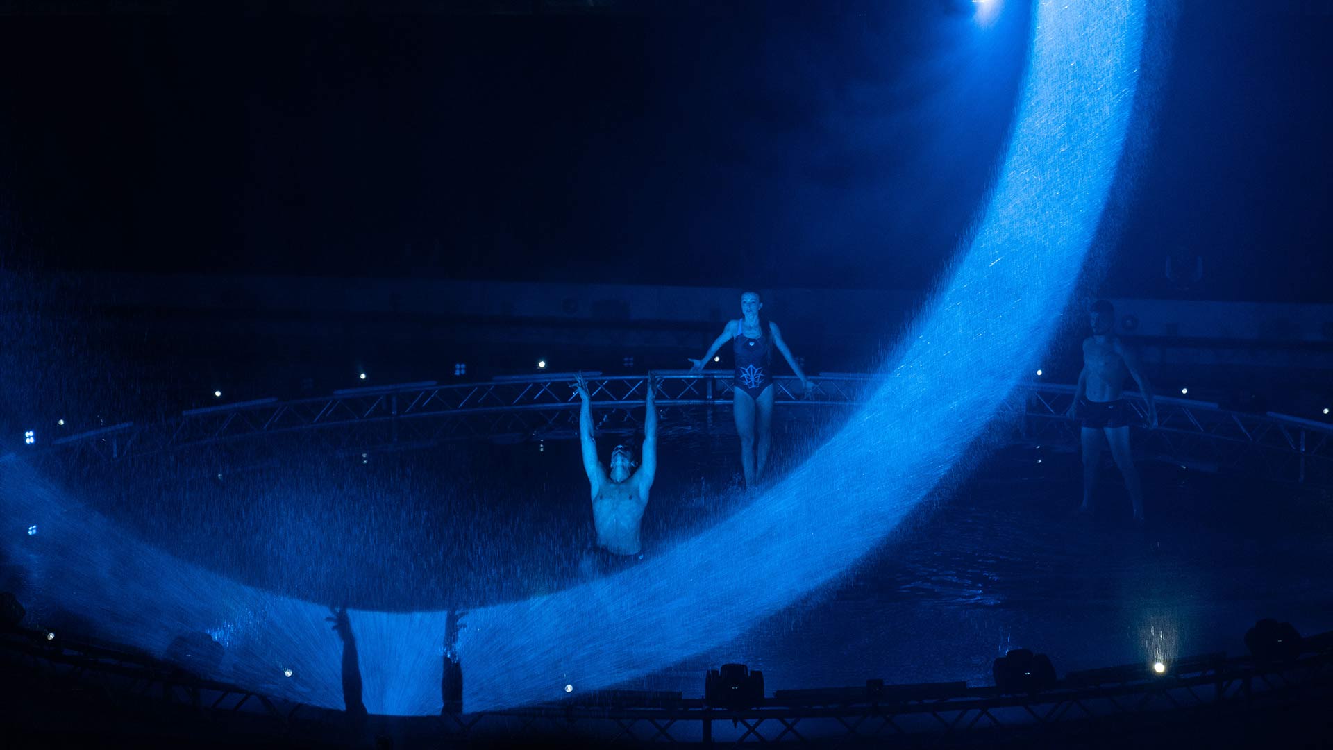 Sede del nostro show è la Piscina dei Mosaici, un’icona del nuoto italiano all’interno del Foro Italico di Roma. La sfida è stata realizzare un palco interamente in acqua per i nostri danzatori, aggiungendo interventi artistici coordinati di atleti provenienti dalla nazionale di nuoto sincronizzato e di tuffo da trampolino.