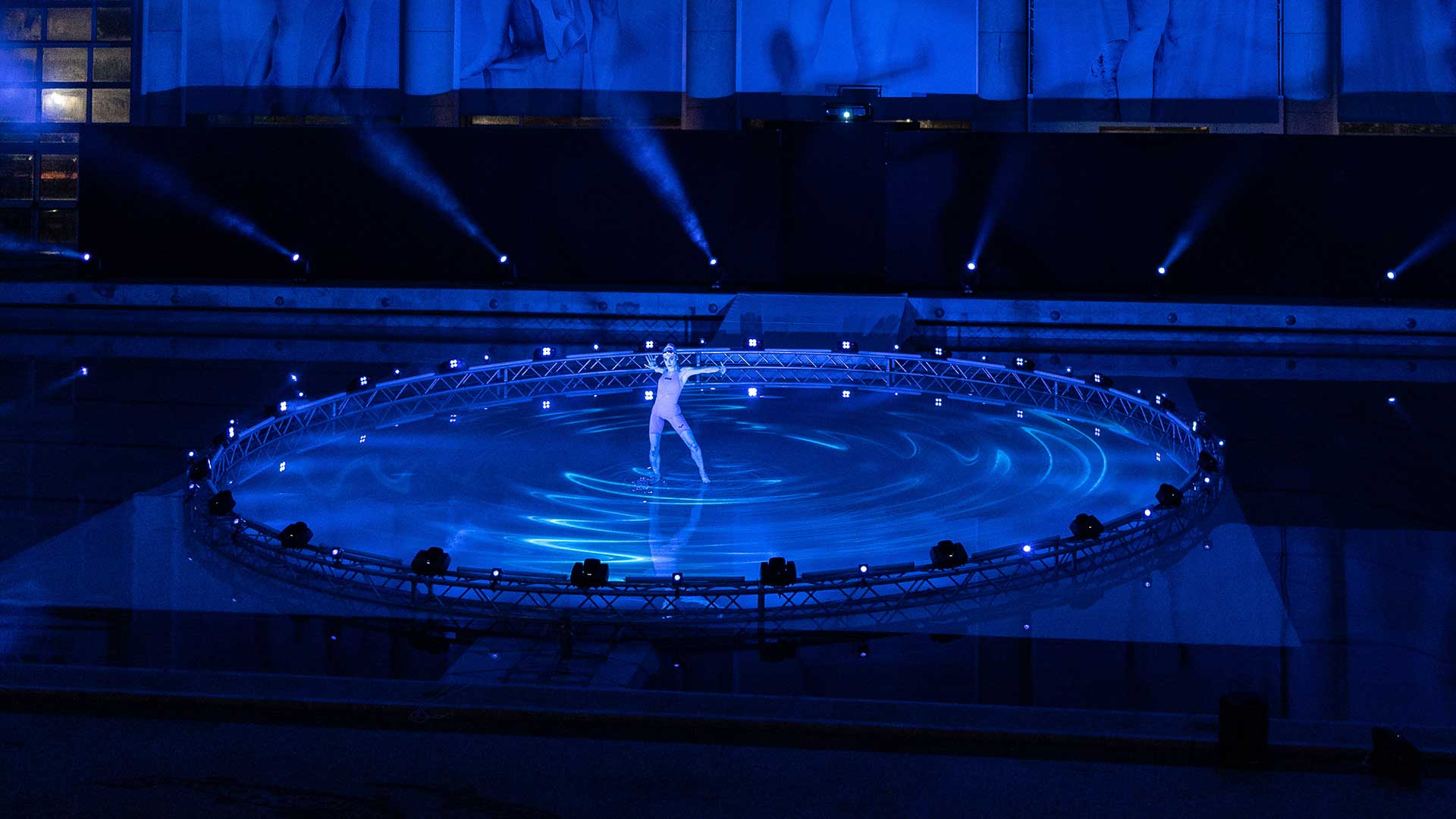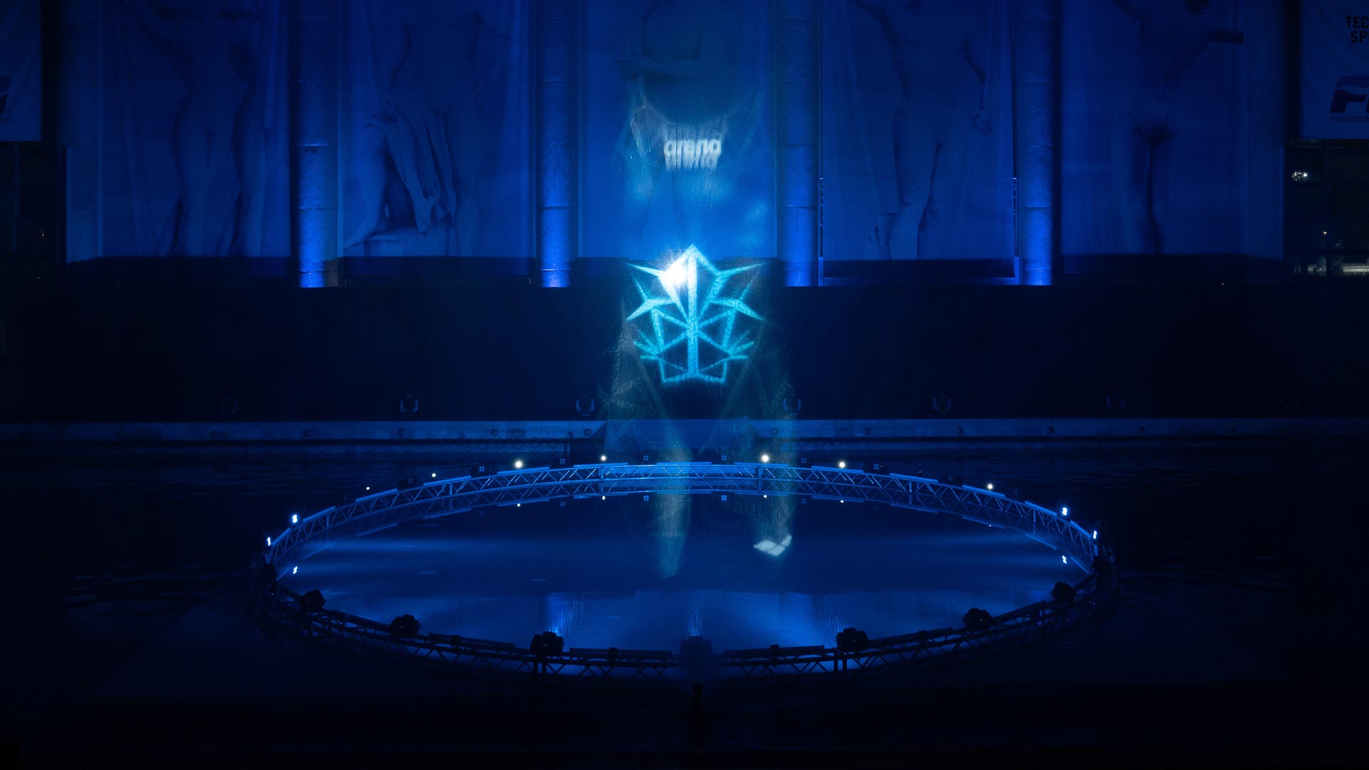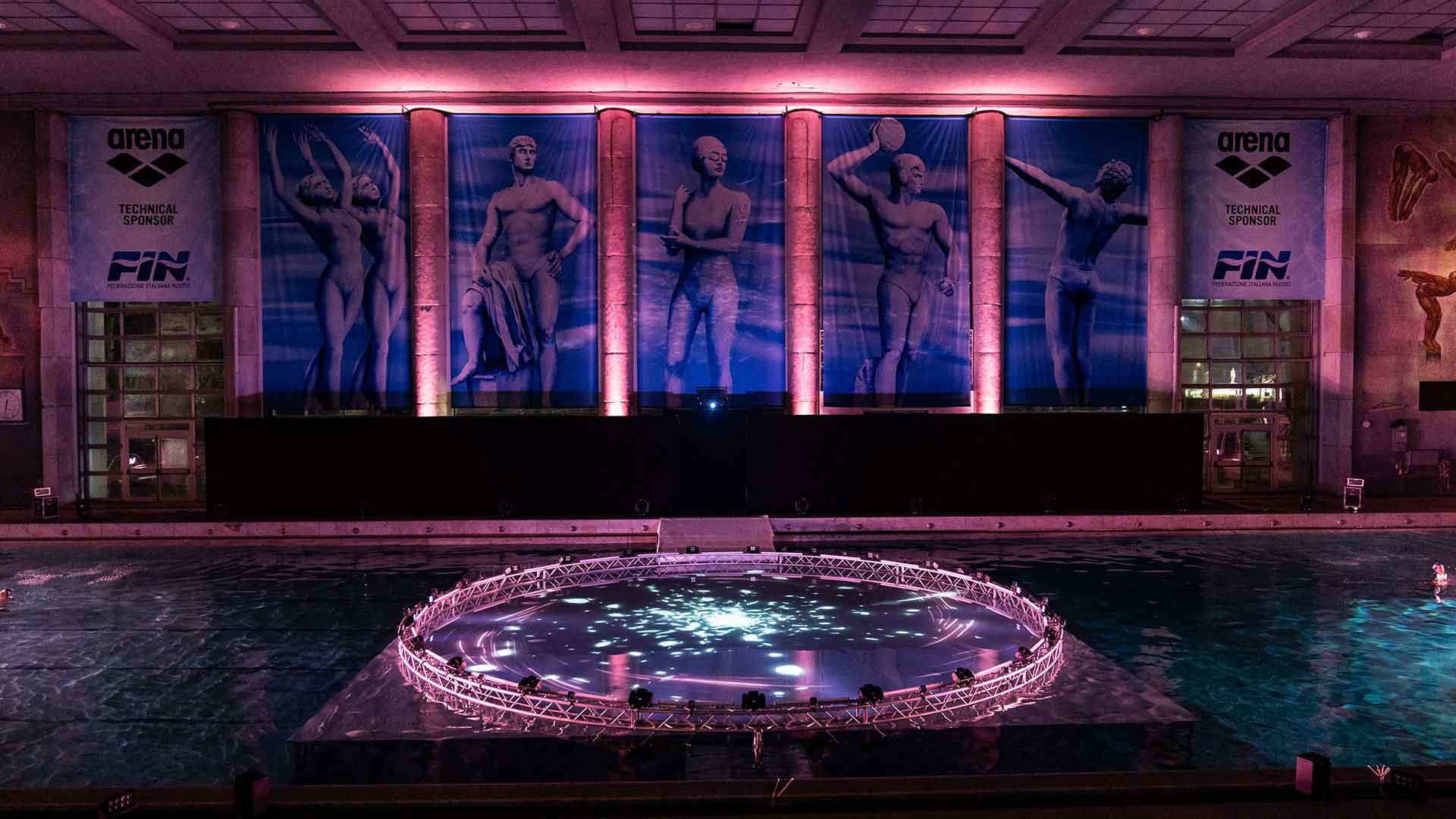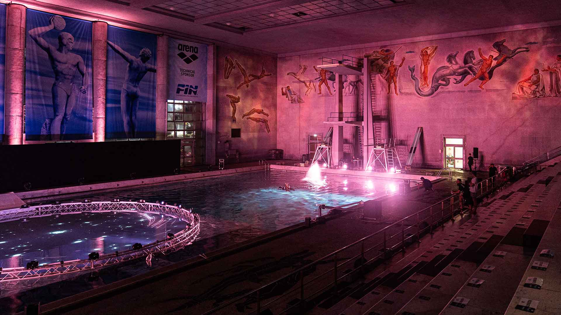Sede del nostro show è la Piscina dei Mosaici, un’icona del nuoto italiano all’interno del Foro Italico di Roma. La sfida è stata realizzare un palco interamente in acqua per i nostri danzatori, aggiungendo interventi artistici coordinati di atleti provenienti dalla nazionale di nuoto sincronizzato e di tuffo da trampolino.