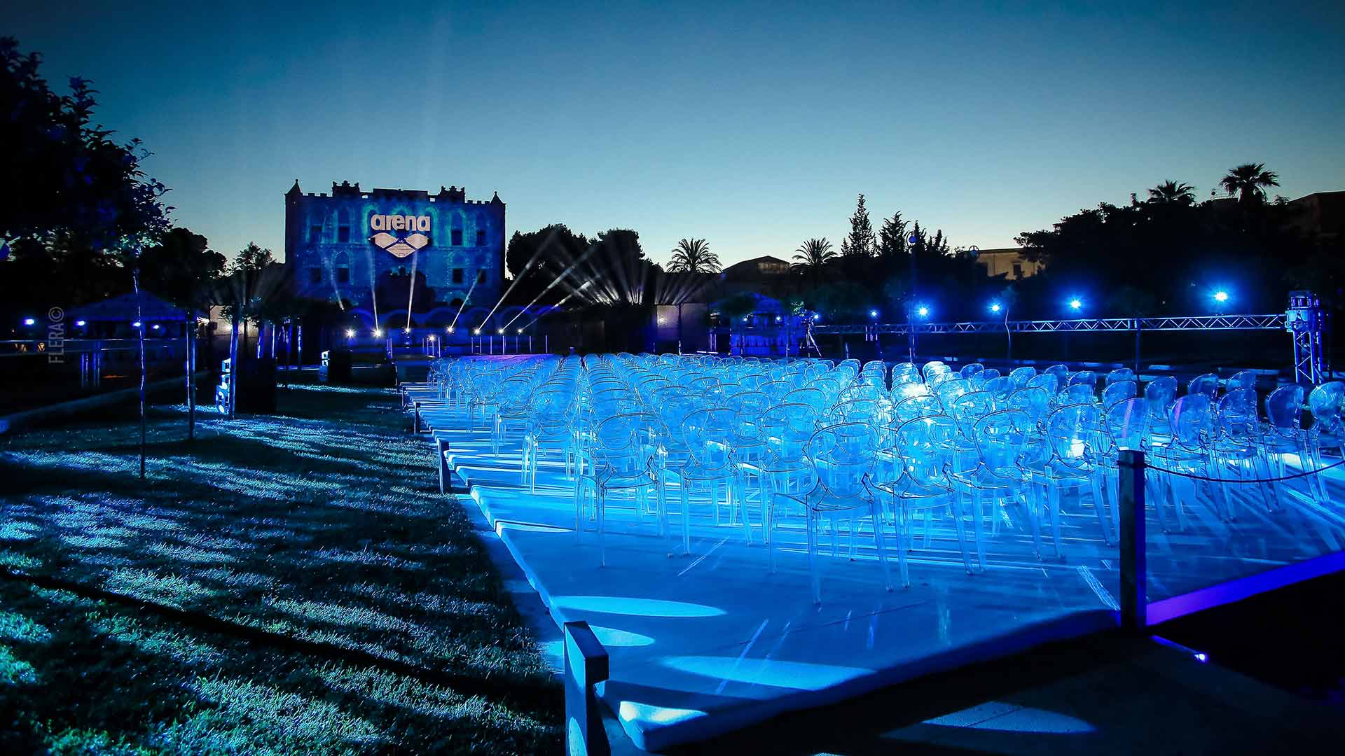 Una location storica come i Giardini della Zisa è stata teatro di un grande spettacolo, dove la presenza dell’acqua ha reso l’ambientazione più incantevole che mai. Una fontana sviluppata su più livelli ci ha consentito di generare pattern kaleidoscopici e video proiezioni sull’acqua, mentre particelle nebulizzate hanno ricreato l'effetto bagnato sui costumi e sui corpi dei danzatori.